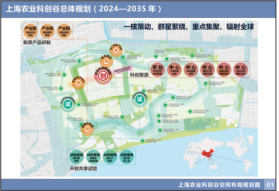 上海農業科創谷(以下簡稱“科創谷”)是上海市建設國際科技創新中心的重要支撐,重點聚焦核心種源、生物基因、植物萃取、智能設施裝備“四大領域”,由上海市奉賢區人民政府與上海市農業農村委員會、上海市農業科學院共同打造。