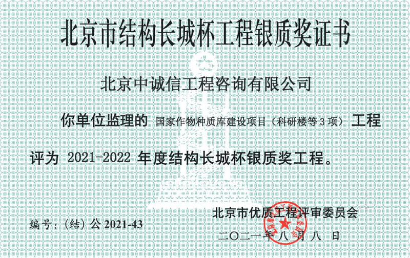 本工程于2021年8月8日被北京市優(yōu)質(zhì)工程評(píng)審委員會(huì)評(píng)定為“北京市建筑(結(jié)構(gòu))長(zhǎng)城杯”工程!投入使用一年多來,運(yùn)行穩(wěn)定,效果良好,得到使用單位的高度評(píng)價(jià)。