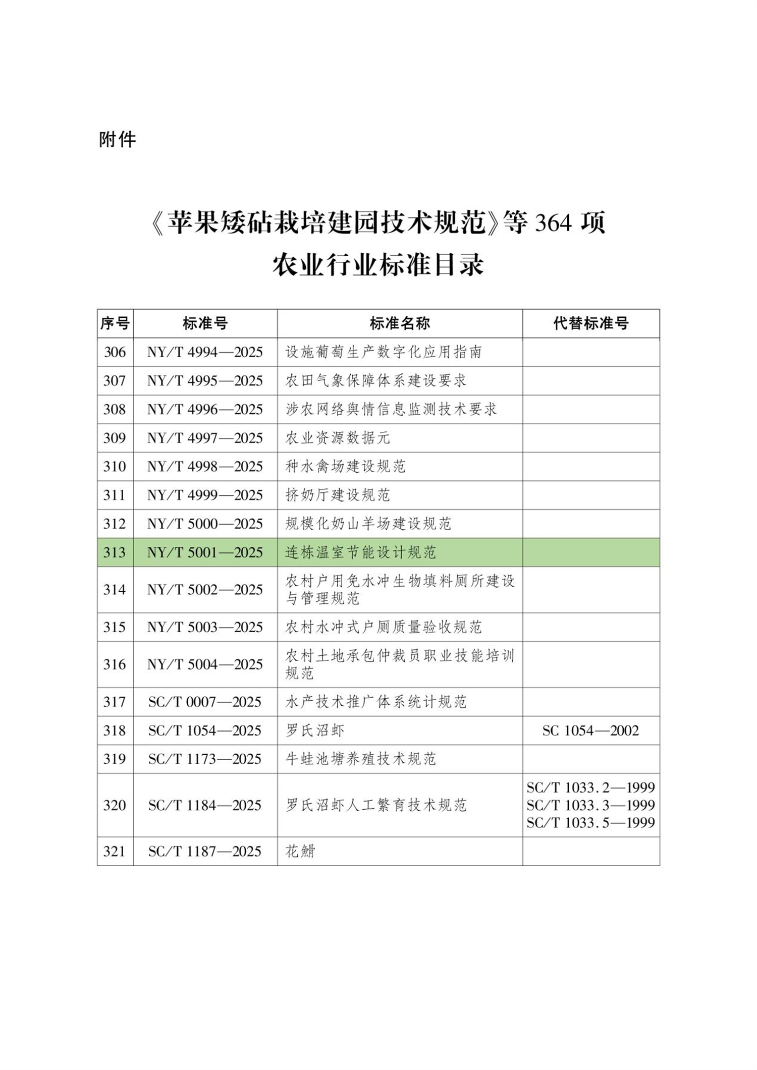 我院設施所主持編制的《連棟溫室節能設計規范》,于2025年12月9日由農業農村部批準發布為中華人民共和國農業行業標準,標準號NY/T 5001-2025,自2026年5月1日起實施。